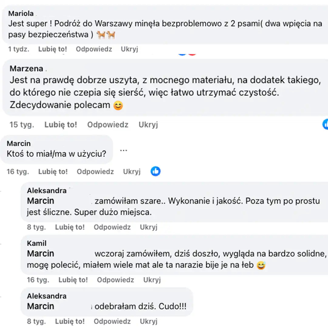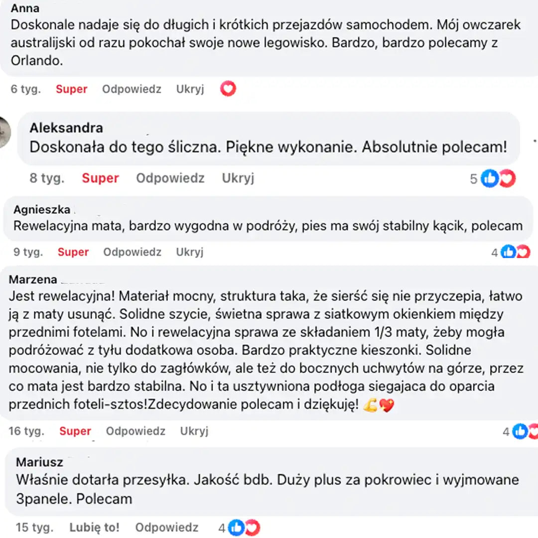 Na tylnych siedzeniach powstało wygodne duże legowisko. Psy nie spadają. Mata jest bardzo dobrze wykończona, przemyślana w najdrobniejszym szczególe. Są kieszonki na smycze, butelkę z wodą, woreczki. Porządne taśmy do mocowania. Jesteśmy bardzo zadowoleni z zakupu