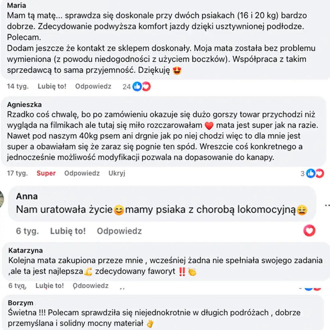 Naprawdę szczerze polecam! Mata swietnie daje rade przy 30kg psie, calkiem sprawnie mozna ja zlozyc i rozlozyc. Obawialismy sie, ze bedzie niestabilna w miejscu przerwy miedzy siedzeniami, ale nic takiego sie nie dzieje, pies moze stabilnie sie poruszac do calej macie. Pies czuje duzo pewniej, a podroze i tak zawsze sa dla niego stresujace.
